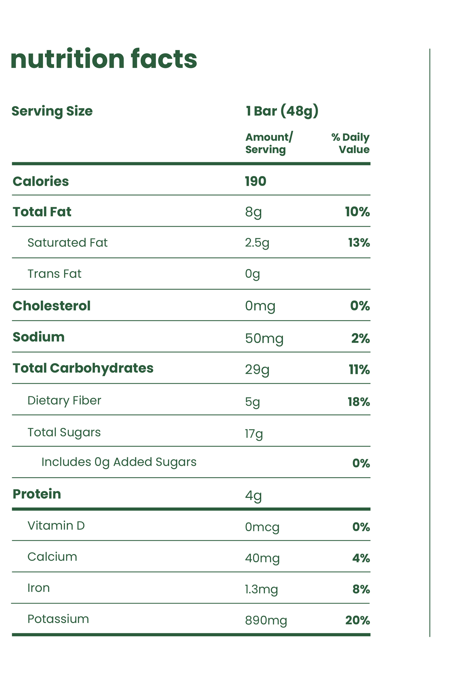 Ingredients: dates, cacao powder, almond butter, dried blueberries, dried cranberries, dried strawberries, shredded coconut, unsweetened cacao chips, almonds, pistachios, sunflower seeds, dried raspberries, walnuts, chia seeds, pomegranate powder, turmeric, vanilla extract, tart cherry powder, kola nut powder, mixed berry flavor, sea salt, rhodiola rosea, bacopa powder